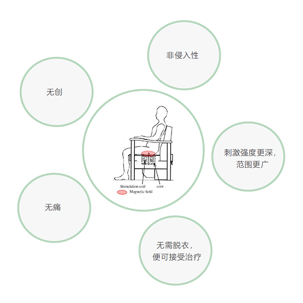 盆底磁刺激技术,通过运动磁场的感应电压产生电流的刺激作用,刺激并激活盆底神经产生神经冲动,促进盆底血液循环,引起肌肉收缩,增强盆底肌肉的活性和力量,从而治疗盆底功能障碍性疾病。与电刺激相比,无创,无痛,更深更广,更安全。