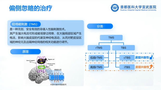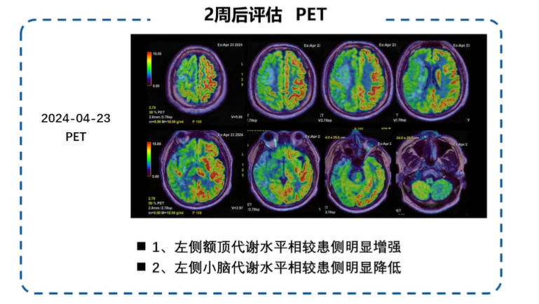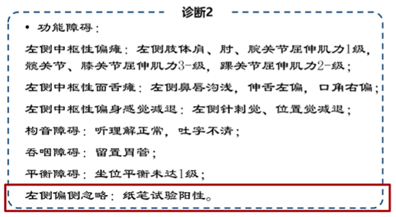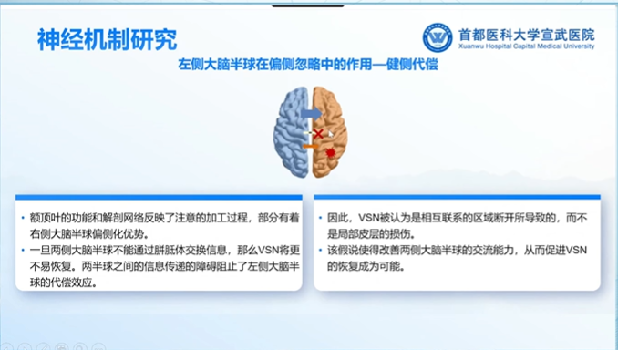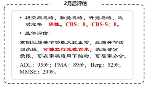 两周后进行临床评估发现:视空间忽略有改善(但是还存在),双侧感觉恢复,听觉忽略阴性,同时对于自身忽略意识增强。