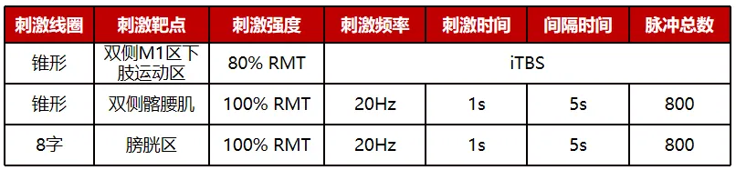 仍有胸腔积液和积气,行胸腔闭式引流;咳嗽咳痰训练,呼吸训练改善呼吸功能;PT(翻身、坐起、维持关节活动范围、转移等);起立床站立训练;卧位自行车;经颅磁刺激(双侧M1区下肢运动区iTBS)、外周磁刺激(双侧髂腰肌和膀胱区高频rTMS),方案如下图所示;下肢及二便针灸;下肢肌肉的功能性电刺激;膀胱区及脐周干扰电;间歇导尿。