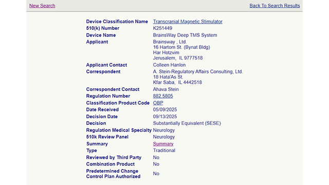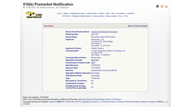 2025年11月,全球无创神经刺激治疗领导者BrainsWay宣布:美国食品药品监督管理局(FDA)已批准扩大其深部经颅磁刺激系统(Deep TMS™)的适用范围,使该疗法可作为针对 15 至 21 岁患有重度抑郁障碍(MDD)的青少年..