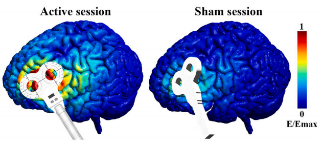伪 TMS 期间,线圈与头皮呈 45° 夹角。