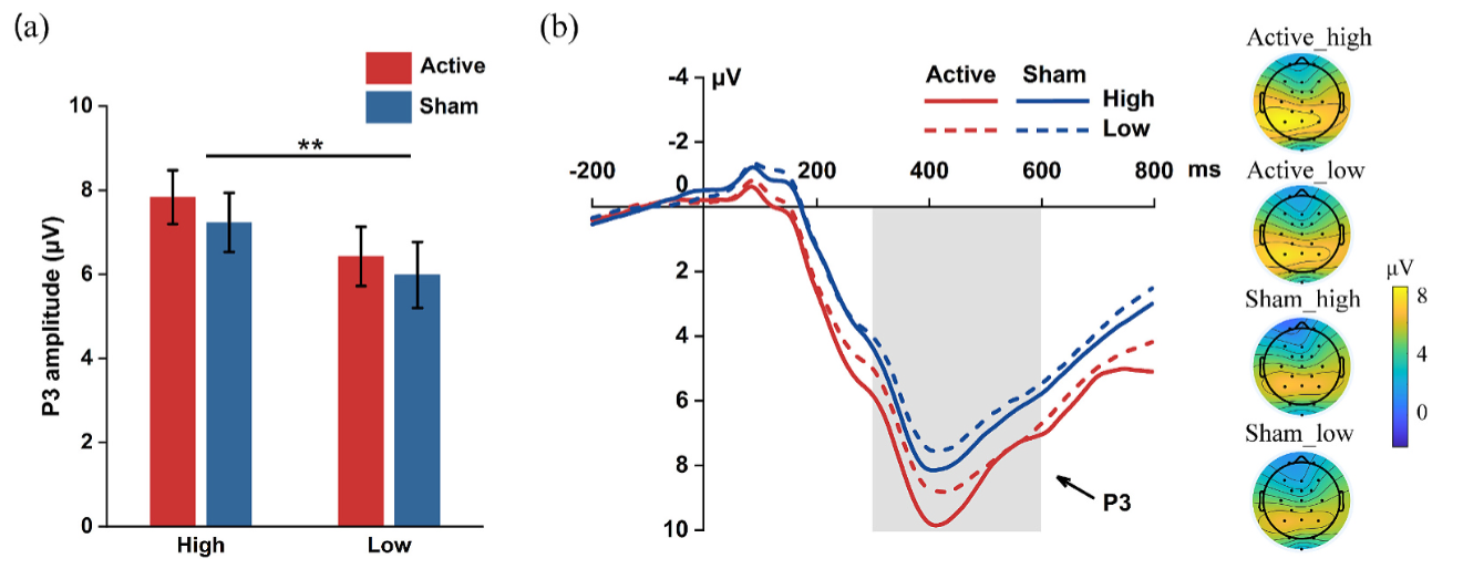 无论是真伪刺激组,与低努力/低奖励选项相比,高努力/高奖励选项产生的 P3 、 CNV 、 SPN 振幅均显著更大。