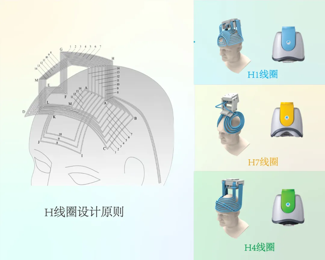 ▲ H 线圈设计原则示意图和3种FDA批准商业线圈。与常规线圈相比,H线圈切向线圈元件大量增加,非切向元件减少。(磁耦合:邻近线圈组件之间通过电流变化,可在彼此线圈附近产生感应磁场,通过自身线圈产生的磁场和临近线圈赋予的磁场叠加,达到更强的磁场强度和更少的磁场衰减。)