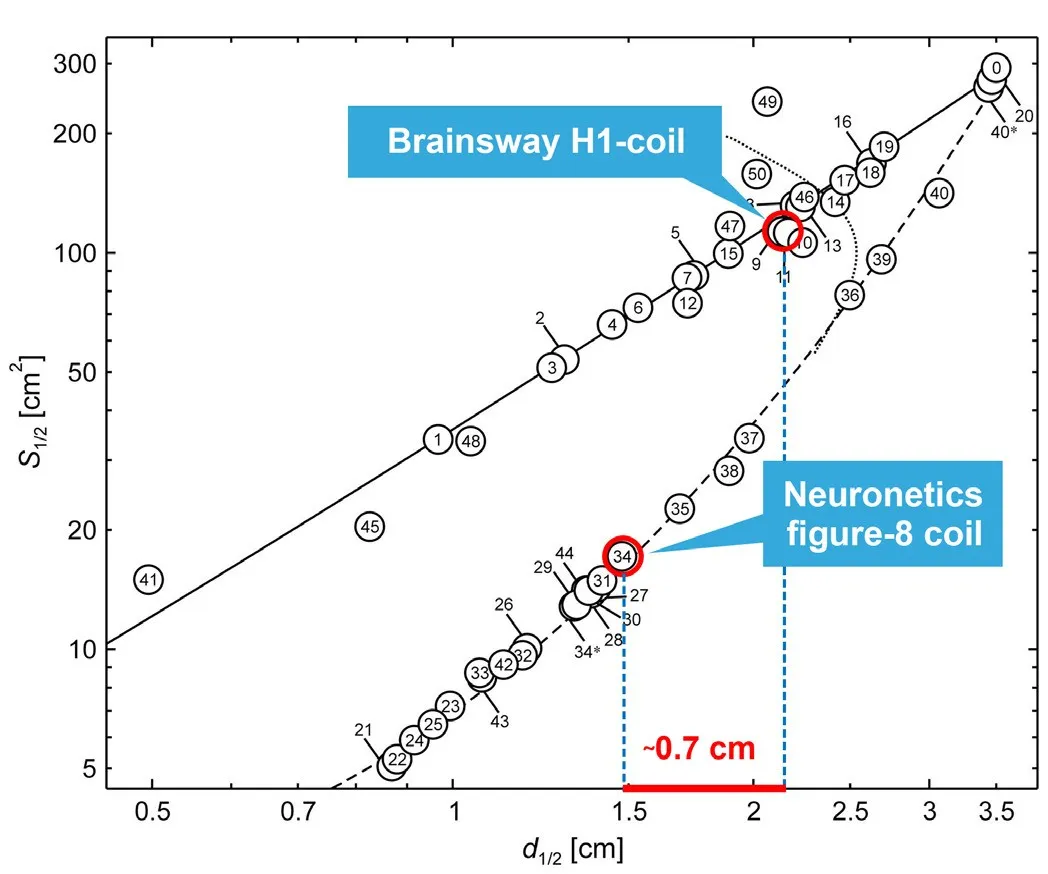 H1线圈和8字形线圈感应的电场分布图,基于在充满生理盐水溶液的模型头中的测量结果。红色像素表示高于神经元激活阈值(100V/m)的电场幅度。以120%阈值强度刺激时,H1线圈在1.8厘米深度处诱导超阈值电场,而8字形线圈可诱发超阈值电场的深度仅为0.7厘米。