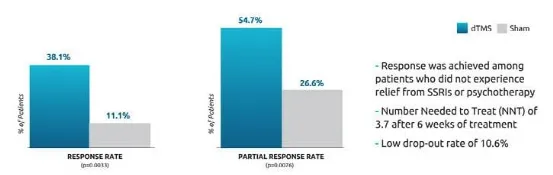 该研究中,受试者以1:1的比例接受DTMS(n=49)或伪刺激(n=51)治疗,正在服用强迫症治疗药物的患者仍按原剂量继续服药。研究者基于耶鲁-布朗强迫量表(YBOCS)评估了治疗前后患者强迫症状的改善情况,量表减分超过30%被视为治疗有效。结果显示,深部经颅磁组治疗有效的受试者比例为38%,而伪刺激组仅为11%。