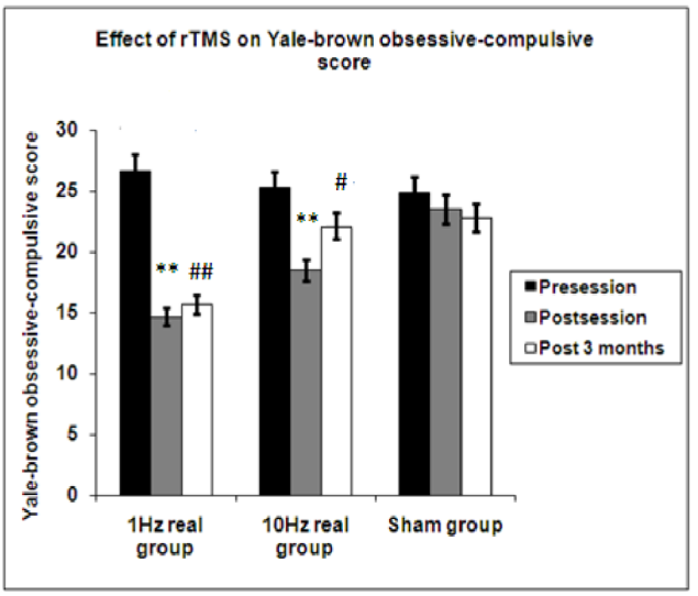 本研究中使用的主要测量系统是耶鲁-布朗强迫症量表 (YBOCS). 第1组患者在接受(1Hz)rTMS治疗后,YBOCS评分显著下降,并持续3个月。第2组患者在疗程结束后接受10 Hz的治疗,其症状得到显著改善(P=0.004),但这一改善在3个月内没有维持(P=0.174),而伪刺激组在疗程结束后和3个月后均未记录到任何变化。[1]