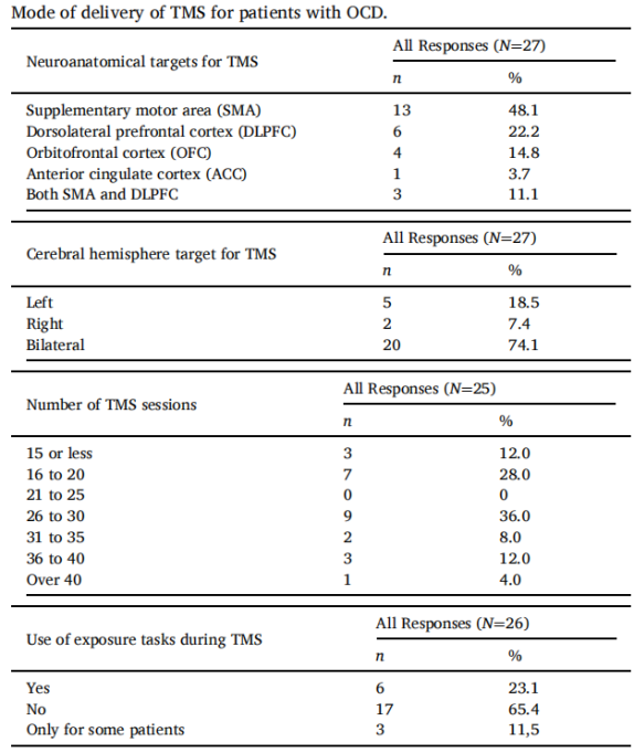 精神病学研究中心于2021年发表了一项针对强迫症患者不同经颅磁刺激方案的国际调查,旨在评估目前TMS治疗强迫症患者的常用方案和治疗趋势。数据收集在2020年4月至6月期间进行,使用自研的包含10个项目的在线问卷,调查了国际上的强迫症患者的TMS治疗诊所。总共分析了来自10个国家的27份有效答复。TMS最常见的目标是补充运动区,刺激通常给予双侧,但不同中心的技术不同。暴露任务在TMS中并不常用。调查结论显示目前还需要进行更多的研究,明确经颅磁刺激治疗强迫症的最佳模式。[4]