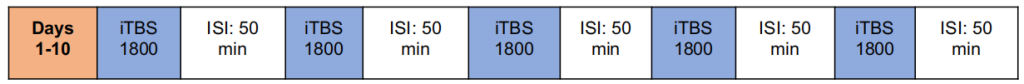 Stimulation was delivered using a transcranial magnetic stimulation device (M-100 Ultimate, Shenzhen Yingchi) with a figure-8 coil (BY90A). The treatment consisted of five sessions per day, with each session delivering 1800 pulses at an intensity of 90% RMT. Sessions were spaced 50 minutes apart. The total treatment duration was 10 days.
