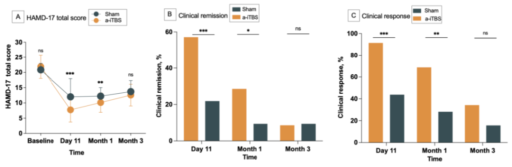 One day post-intervention (day 11), the a-iTBS group showed a significantly greater reduction in mean HAMD-17 scores compared to the sham group (active: 8.09, sham: 12.28; mean difference: 4.92 points), which was statistically significant. The a-iTBS group also exhibited significantly higher remission rates (54.05% vs. 21.88%) and response rates (86.49% vs. 40.54%) than the sham group, with statistical significance.