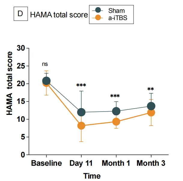 The a-iTBS group maintained significantly lower mean HAMA scores than the sham group (active: 9.60, sham: 12.83; mean difference: 3.23 points, *p* = 0.002).
