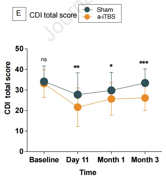 The a-iTBS group continued to show significantly reduced mean CDI scores relative to the sham group (active: 25.38, sham: 32.93; mean difference: 7.55 points, *p* < 0.01).
