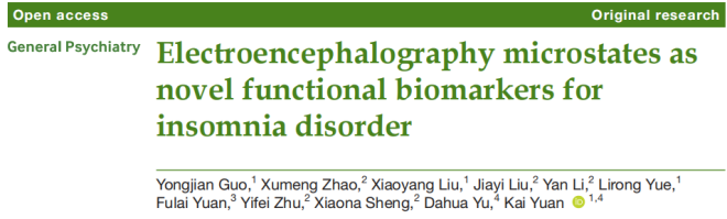2.Reference: Guo, Y., Zhao, X., Liu, X., Liu, J., Li, Y., Yue, L., Yuan, F., Zhu, Y., Sheng, X., Yu, D., & Yuan, K. (2023). Electroencephalography microstates as novel functional biomarkers for insomnia disorder. General psychiatry, 36(6), e101171. https://doi.org/10.1136/gpsych-2023-101171