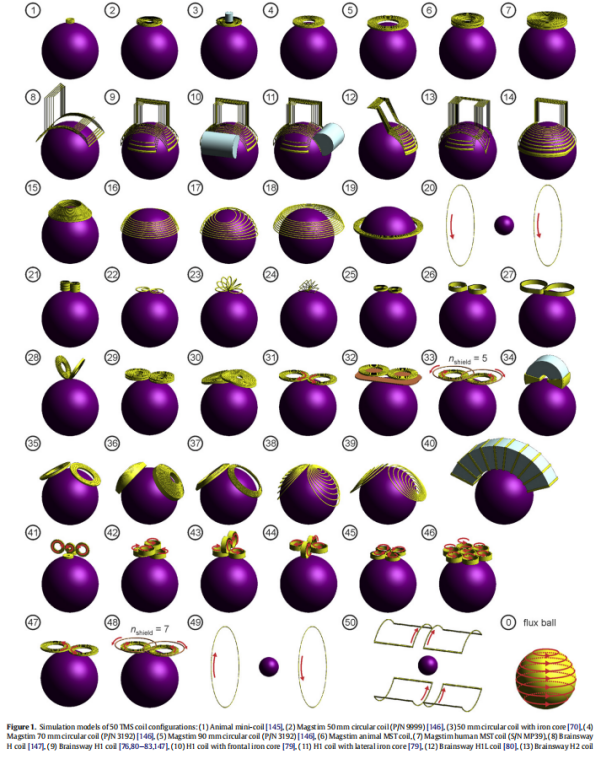 目前,经颅磁刺激线圈的种类约有50种,如下图所示:有常见的圆形、“8”字形、锥形、“H”形;也有椭圆形、V形以及四叶形等特殊形状的线圈。